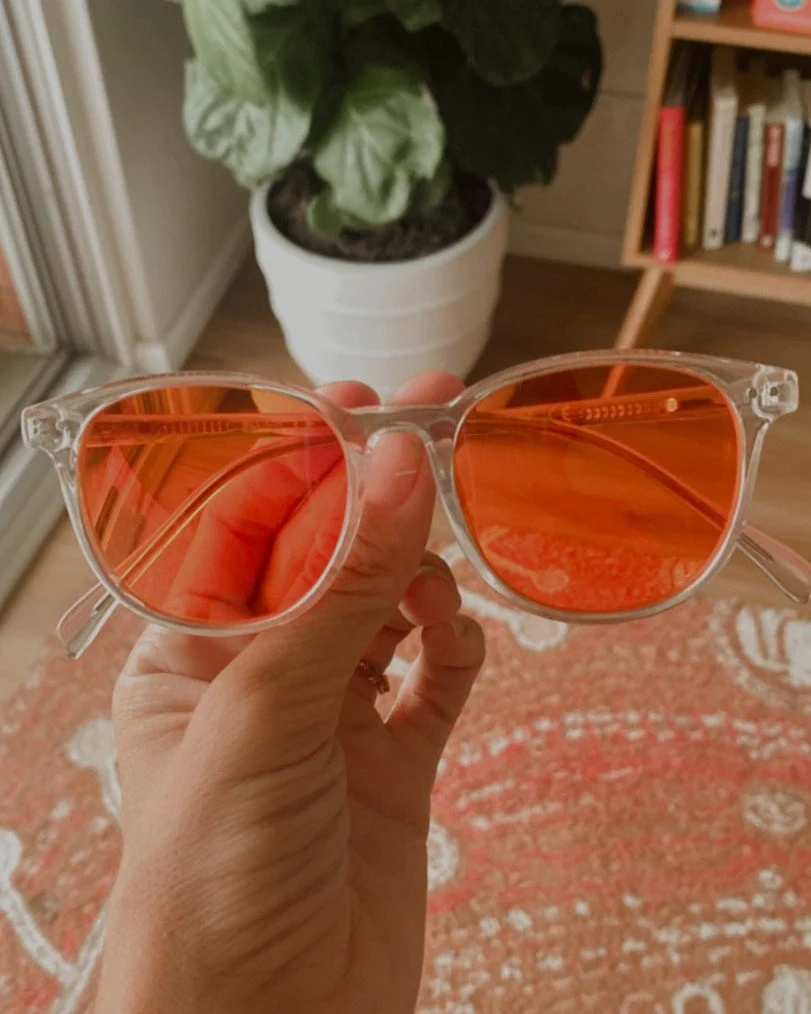 With blue light blocking glasses, you want to get ones where the shades are colored so they work optimally. My glasses have an amber lens, which means they will allow some green light in, but block blue entirely.