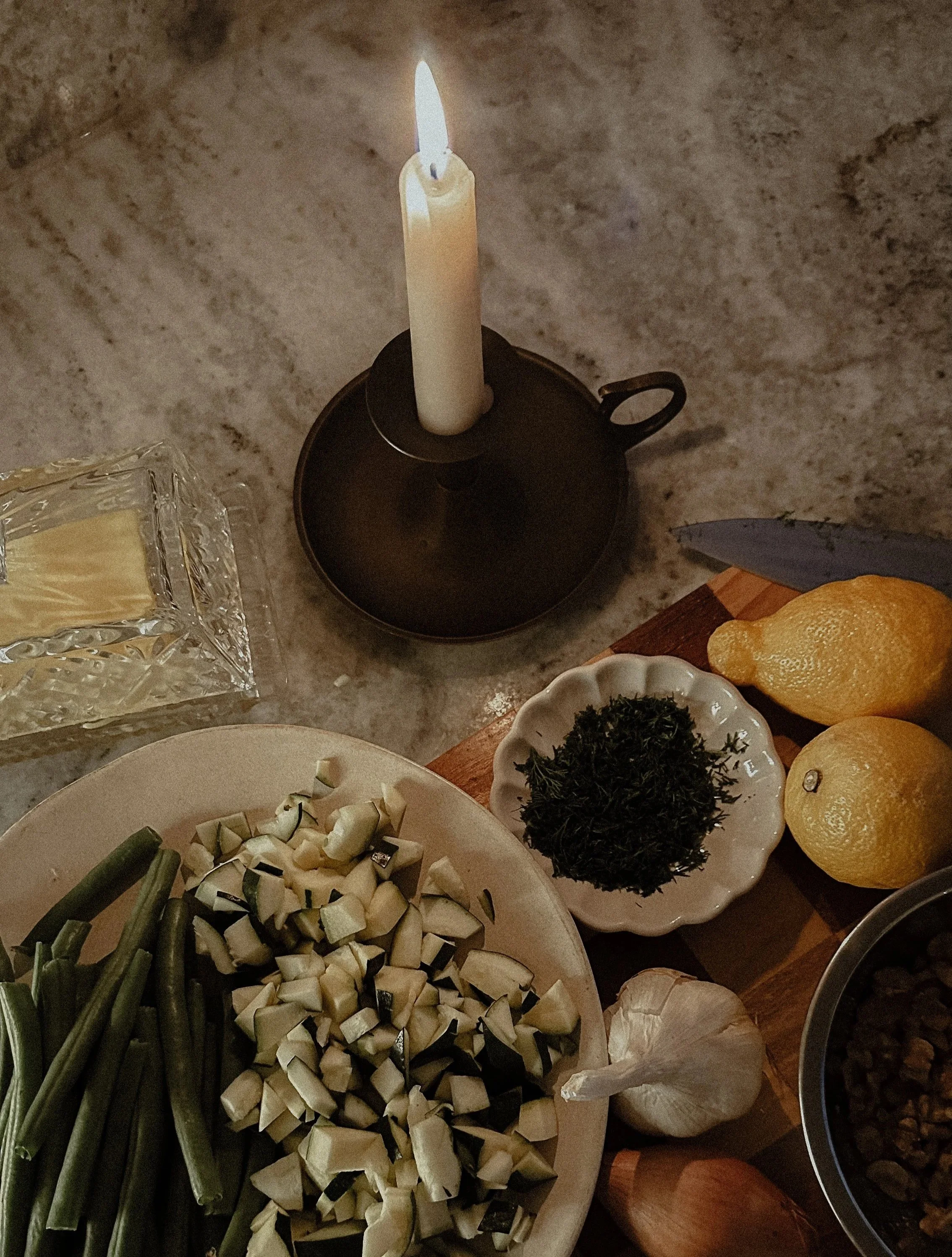 However, as the autumn and winter months set in. The sun sets earlier, and we are eating around sunset or a little after. I have a candle on our dining table that we use and a lamp with an ambient light bulb. Neither of these replicate the sun like big bright overhead lights do. Candlelight and ambient amber lights are gentle and soft, lovely for slow living.